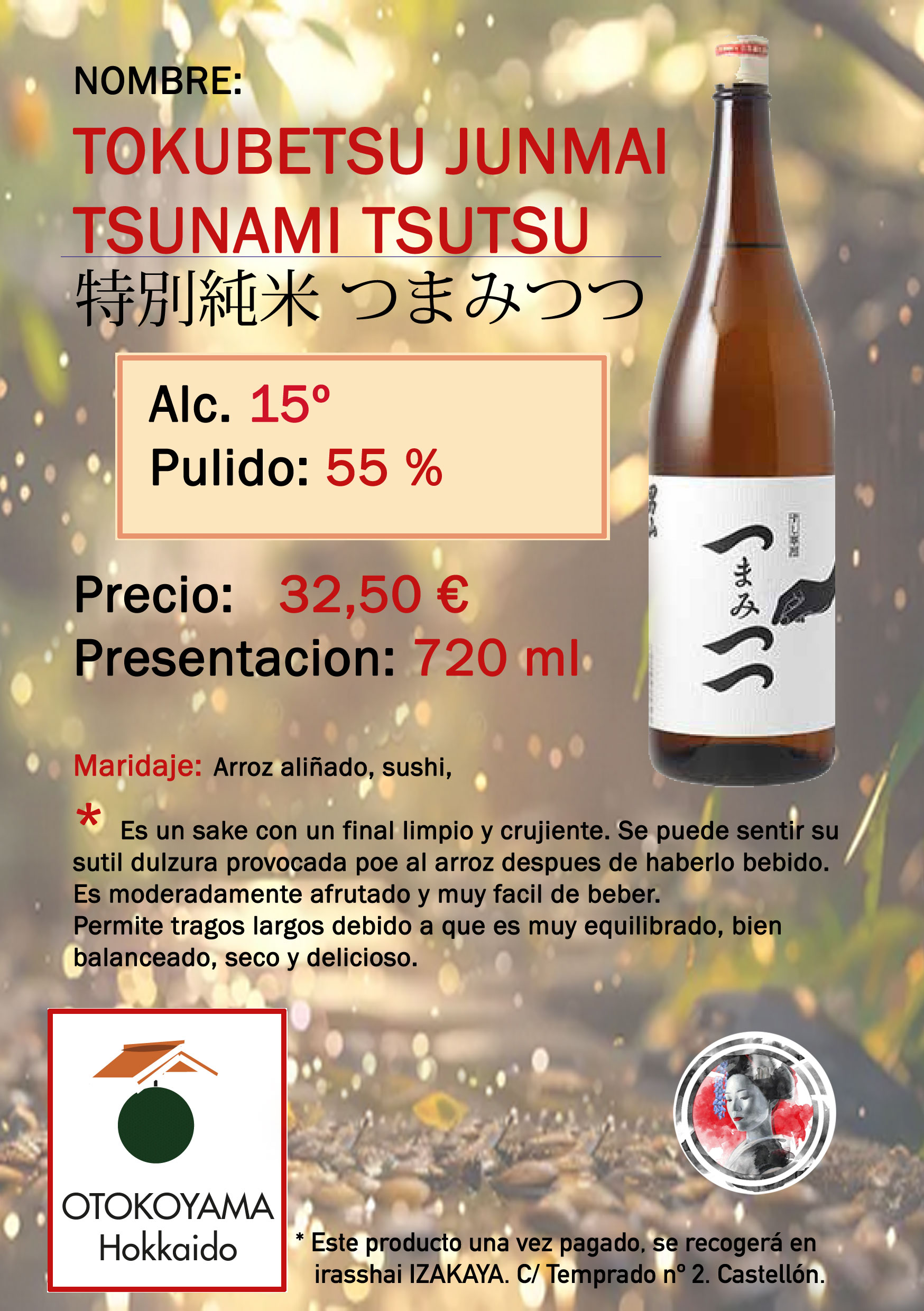 Es un sake con un final limpio y crujiente. Se puede sentir su sutil dulzura provocada por el arroz después de haberlo bebido.